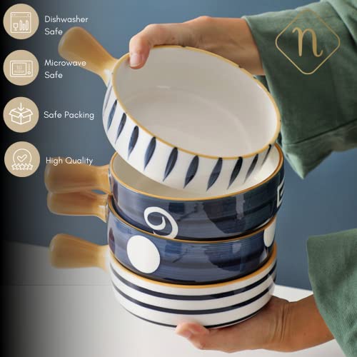 Feature | Hand-Painted Surface: White and blue bowls feature a yellow handle, giving them a handmade feel and a clean, elegant appearance perfect for serving food. |