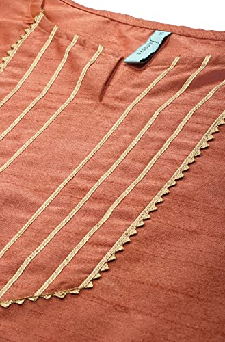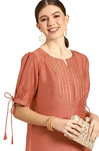 An exploration of the modern vocabulary of design, this peach kurta and pant set from Janasya is sure to allure you. Tailored to sartorial perfection from poly silk, it features lace detailing on yoke with puff sleeves and comes with matching solid pant. Pair it up with traditional earrings and mojris for complete ethnic look.