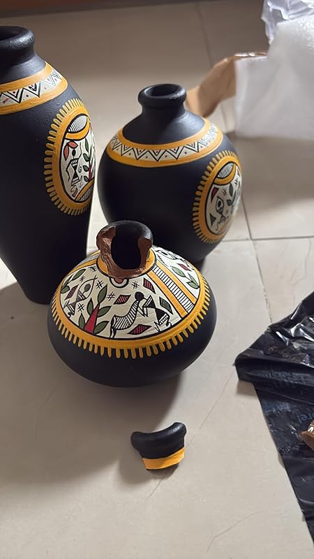About this item Please refer to dimension image before buying. Size of Vases: Big Vase (Length x Width x Height) – 7 X 3 X 3 inch, Medium Vase (Length x Width x Height) – 4 X 4 X 5 inch & Small Vase – (Length x Width x Height) 4.5 X 4.5 X 3.5 inch Authentic Madhubani Art: The flower vases for home decor is meticulously hand-painted by skilled artisans, showcasing intricate Madhubani designs that reflect the rich cultural heritage of India. The attention to detail and precision in the artwork make these vases true masterpieces. Premium Terracotta Material: These decorative vases are crafted from high-quality terracotta, known for its durability and timeless appeal. The terracotta material ensures that each piece is unique with its own distinct texture and natural variations. Set of 3 Vases: This set includes three different-sized vases, allowing you to create a captivating display arrangement. Use them individually to adorn different corners of your home or group them together to create a visually appealing centerpiece. Versatile Decor: The charming yellow color complements various interior styles, from contemporary to traditional, making it a versatile addition to any room either living room, bedroom, coridor or office. Whether displayed on a mantel, shelf, or table, these vases will instantly add a pop of color and artistic flair to your space. Disclaimer: Not suitable for natural flower because of the hand-painting done, the actual product may slight vary owing to each product being hand made. It’s difficult to replicate the exact color/shade/art while creating the pieces. Perfect Gift: Share the joy of artistic decor by gifting this vase set to your loved ones. Perfect for housewarmings, birthdays, or any special occasion, these decorative vases are a thoughtful and stylish addition to any home.