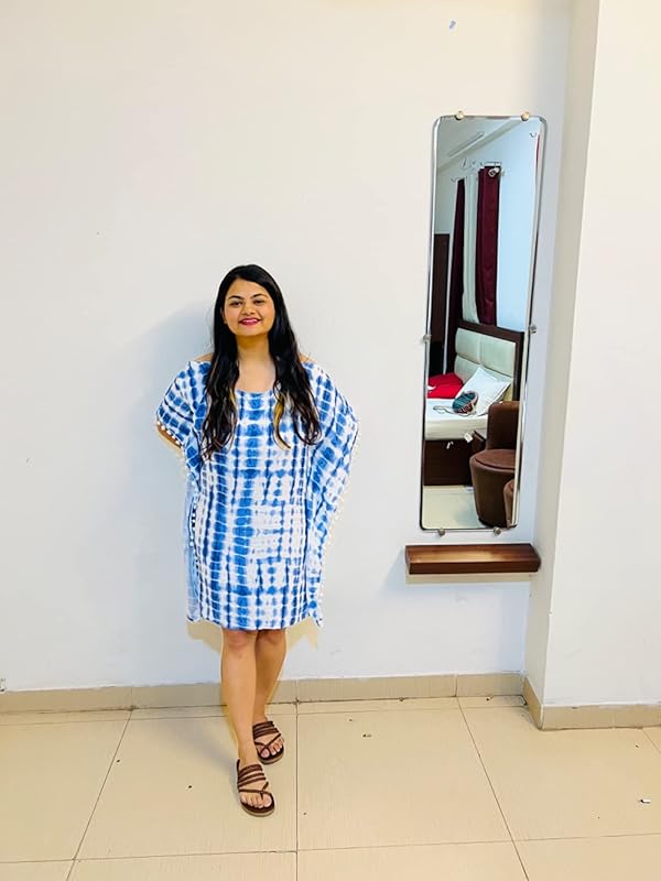 blue and white tie-dye kaftan dress with pom-pom